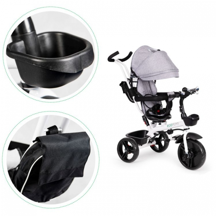 De asemenea, tricicleta este dotata cu 2 recipiente din plastic in care copilul dvs. isi poate ascunde jucariile de mica dimensiune sau comorile gasite in timpul plimbarilor.